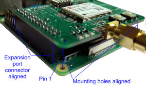 - Carefully mount the RasPiGNSS expansion board on the Raspberry Pi’s P1 expansion port, precisely aligning all pins with the respective holes on the RasPiGNSS connector as shown in the picture to the right. Do not exert excessive force as you may bend or break pins, voiding your warranty on both the Raspberry Pi and the RasPiGNSS expansion board! Take utmost care to avoid misalignment of the pins, as applying power to a misaligned RasPiGNSS will definitely kill your Raspberry Pi and/or the RasPiGNSS expansion board!
